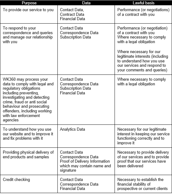 The table below explains the ways in which we use your personal data and the legal grounds for that processing. Please contact us at hello@wk360.com if you would like further information about the relevant legal grounds.